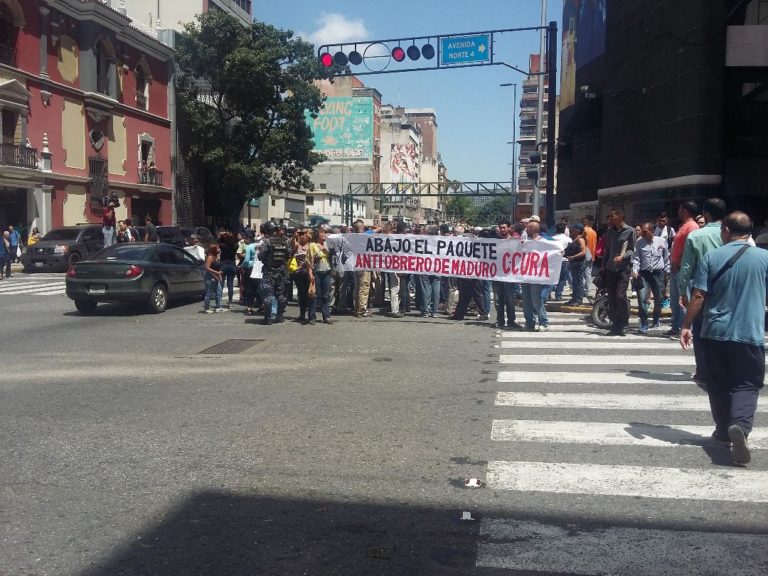 For over two hours, the concentration of active and retired workers held up in the Carmelitas corner in front of the Central Bank of Venezuela. Strangely enough, the police and the National Guard allowed the rally forth. What many of those present commented is that after the murder of the Captain Acosta Arevalo (accused of conspiracy) and the blinding of a Tachira youth in a protest over domestic gas, the government has been weakened and preferred not to repress a protest happening only 3 blocks away from the Miraflores presidential palace.