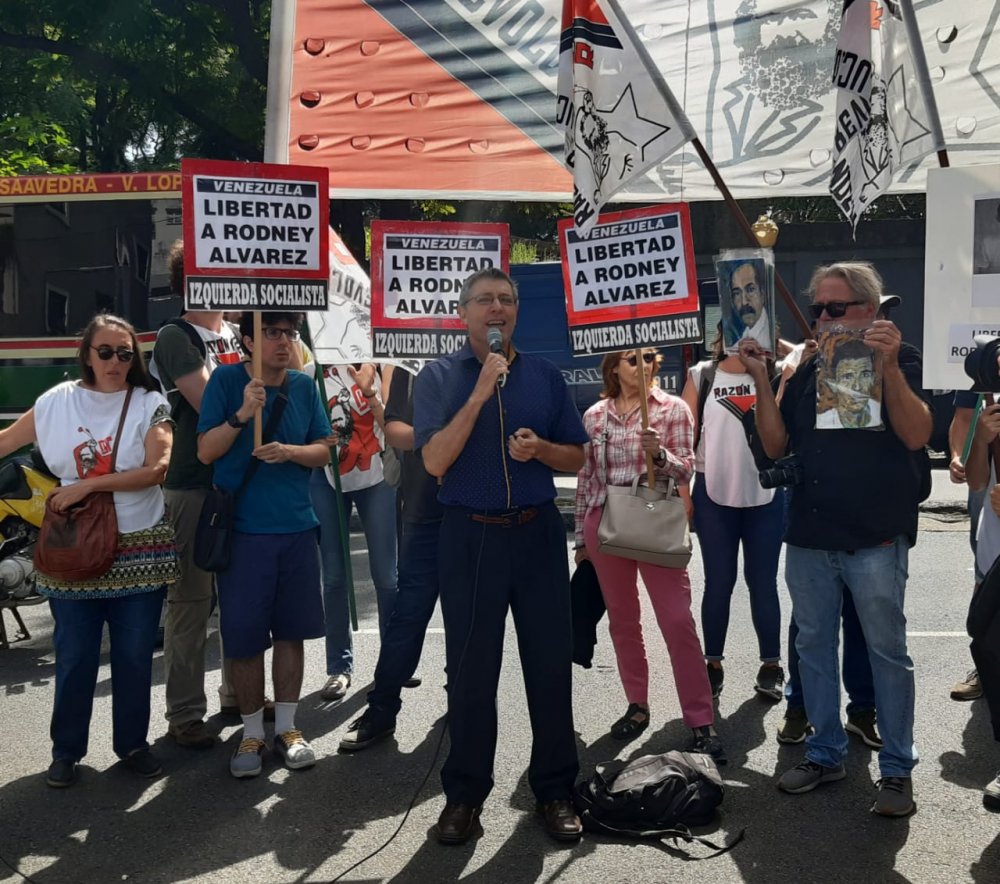 Workers and activists of the Venezuelan left opposition gathered in Caracas in front of the Tribunals to demand Rodney Alvarez’s freedom this Monday morning. Members of the Socialism and Freedom Party (PSL), the C-cura union tendency, alternative web page La Guarura and other organizations demonstrated. At the same time, a protest led by leftist organizations in Buenos Aires gathered in front of the Venezuelan embassy with the same demand. Congress member and Socialist Left leader, Juan Carlos Giordano, took part in the demonstration, as well as Ademys teacher union leader Jorge Adaro, and activists from RyR and other organizations. Messages of solidarity from Argentinian unions were read in front of the Venezuelan embassy.
