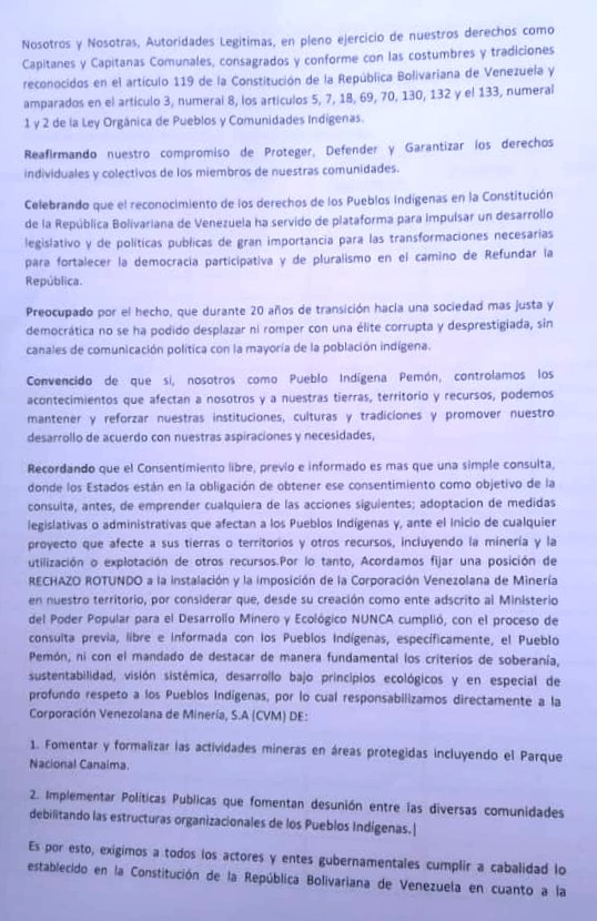 Therefore, we agree to establish a position of ROTUND REJECTION to the installation and imposition of the Venezuelan Mining Corporation into our territory, because we consider that since its creation as an entity assigned to the Ministry of the Popular Power for Mining and Ecological Development it has NEVER complied neither with the process of prior consultation nor with the mandate to fundamentally emphasize criteria of sovereignty, sustainability, systemic vision, development under ecological principles and, especially, deep respect for indigenous peoples. For these reasons, we hold the Corporación Venezolana de Minería, S. A. directly responsible for: