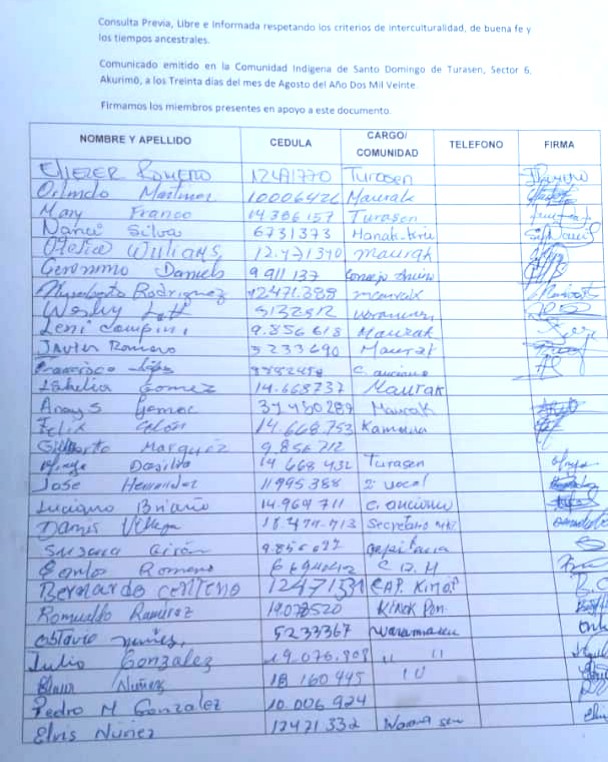 Communiqué issued in the indigenous community of Santo Domingo de Turassen, sector 6 Akurimö, on the thirtieth day of August of the year Two Thousand and Twenty.