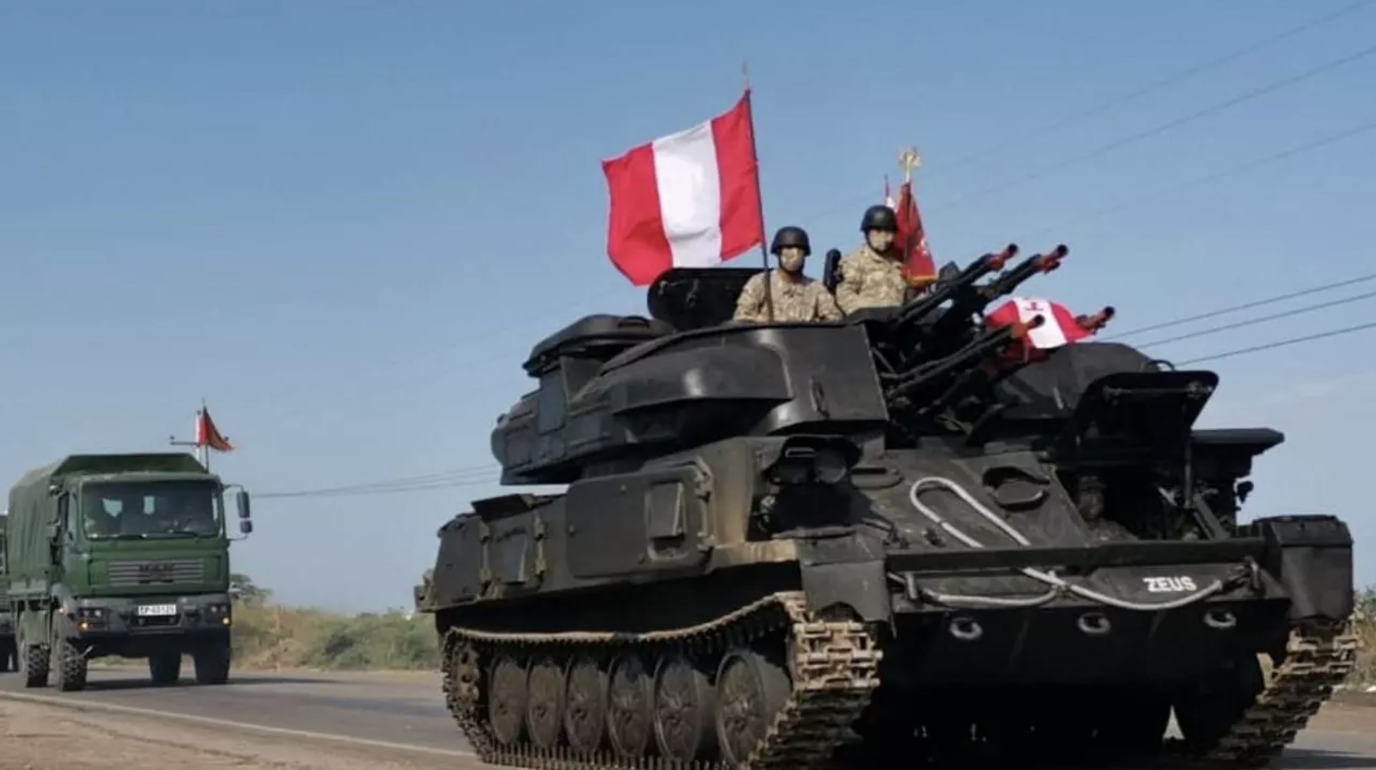 Photo credit: Taken from France 24’s site © EFE/ Andina. Armored units of the Peruvian Army move towards the border with Ecuador in support of the National Police to control migrants’ access in Tumbes (Peru).